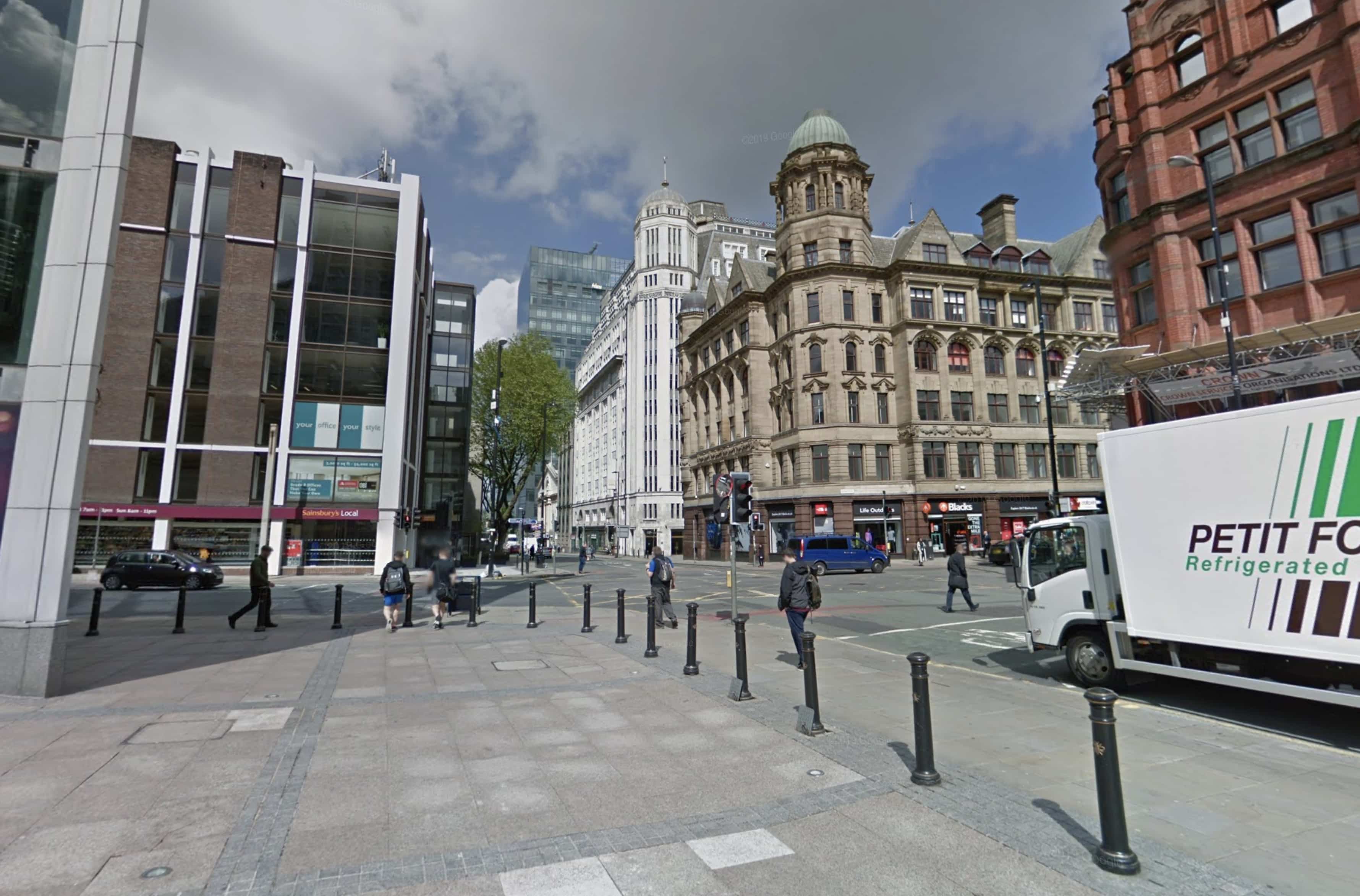 Let’s take a look at a typical use of bollards. Here’s an image from Manchester, featuring the classic cannon lookalike: